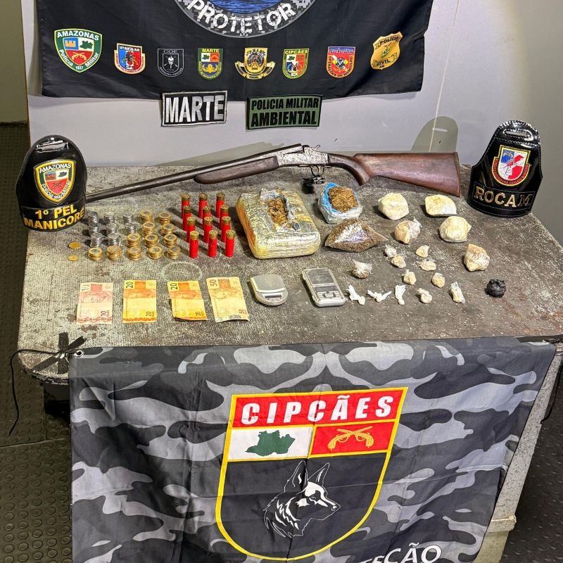 A Polícia Militar do Amazonas (PMAM) prendeu dois homens em flagrante por tráfico de drogas e apreendeu entorpecentes, armas e munições durante ação da Base Arpão 2, nas proximidades de Coari (a 363 quilômetros de Manaus). A operação foi desencadeada após denúncia anônima recebida pela Secretaria de Segurança Pública (SSP-AM).