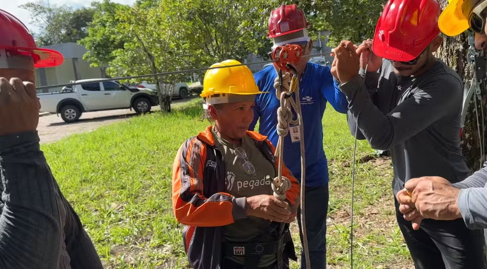 “O cabo é preso de uma árvore a outra, e por ele a carga desliza com ajuda da gravidade. É simples, barato e funciona muito bem”, explicou o instrutor técnico Alacimar Viana.